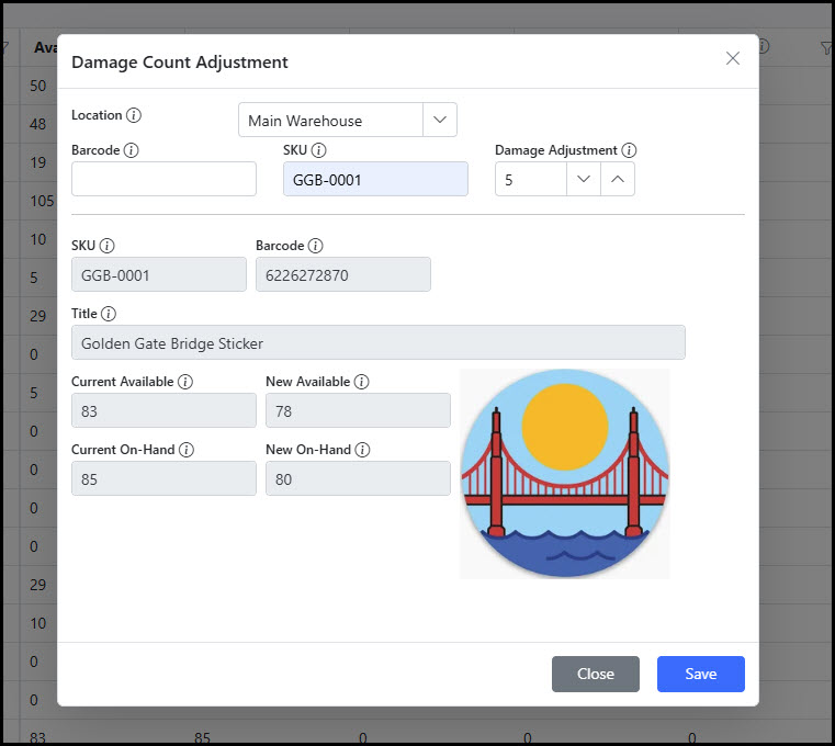 Adjust Damage is an additive process. Counts are reduced from On Hand and Available based upon the damaged quantity entered. The New Available and New On-Hand fields will dynamically adjust by reducing the amount entered in Damage Adjustment from the current counts. Click Save to enter the adjustment and the counts are automatically synched with Shopify.