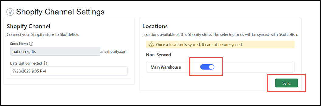 Click Sync to synchronize Skuttlefish with the Shopify Storefront.