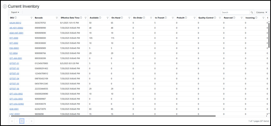 Current Inventory Grid The Current Inventory Grid displays the real-time breakdown of available product by location as well various other inventory status of product within each location. The Current Inventory Grid allows for searching, filtering, and sorting of contents as well as the ability export to Excel or PDF file formats.