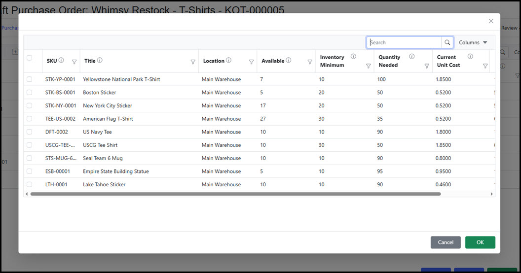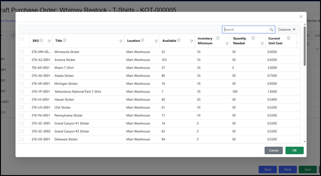 The Add Select screen shows the detail of each SKU (Available, Min/Max, Minimum Order Amount, Quantity Needed, Current Unit Cost, etc.). Click the Column dropdown to access additional details within the grid. The default Quantity Needed field attempts to defualt the amount needed in the order for the item based upon the SKU minimum and maximum settings as well as the vendor minimum order requirement setting for the SKU.