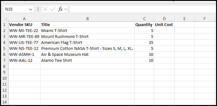 Click Generate Quote to produce the quote sheet for vendor assigned pricing. The quote sheet includes the product title and vendor SKU ID for better identification. Each item includes the total quantity in the order and an empty column to fill in the unit cost received from the vendor. Below is an example of a generated quote file used for capturing pricing from a vendor. Variations to the Generate Quote format can be provided.