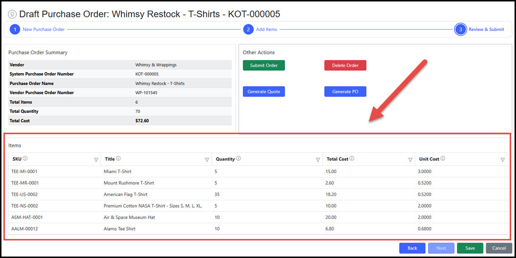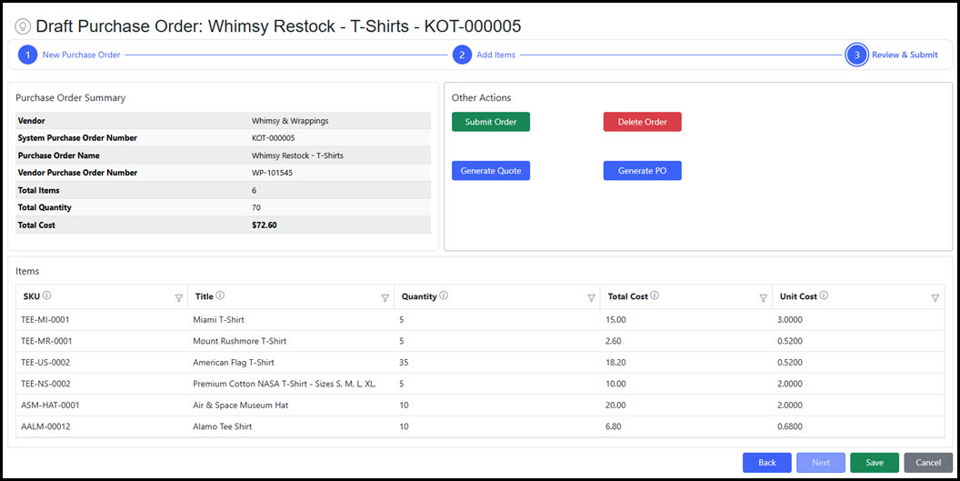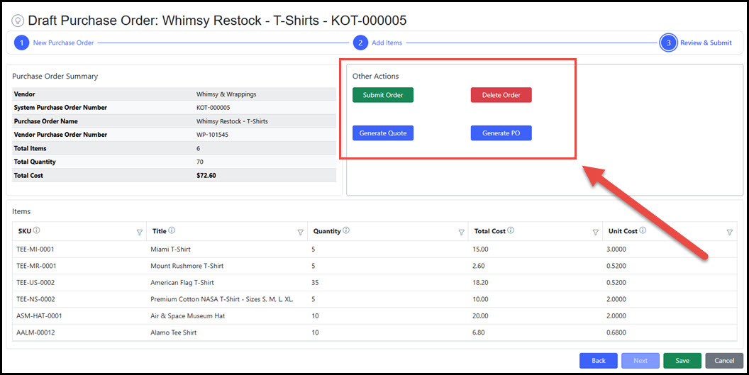 | Step 3 - Submit Order | Submitting sets the Purchase Order status to "Submitted" where it is then maintained in the Purchase Order Management area. Once submitted, the Draft Purchase Order process is complete. |