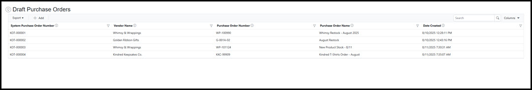 Click Add to create a new Draft Purchase Order.