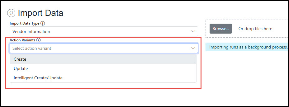 Step 2 - Select Action Variant The Action Variant represents how the data will be impacted by the Import: