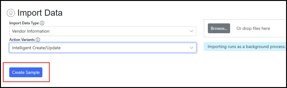Step 3 - Create Sample Layout (Optional) The Create Sample button downloads an Excel files in the format required for the Import Data Type selected. This is not required for the process if user has the proper layout.