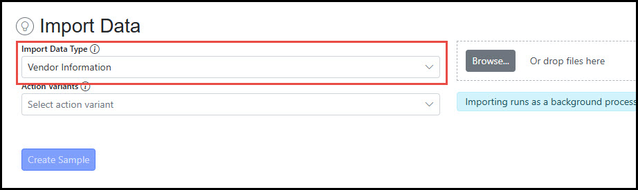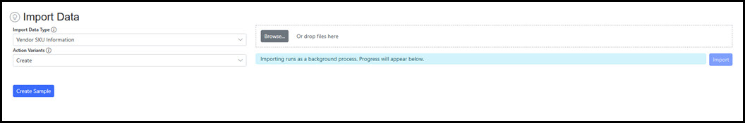 Step 1 - Select Import Data Type Select the Import Data Type. This selection will represent either a single attribute table (Vendor, SKU, etc.) or a combination of tables to be used for the import.