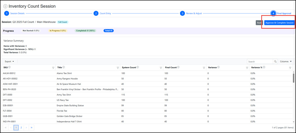The Final Approval step displays an overall variance summary along with SKU-level variances for your count session. When you're ready to finalize the counts, click Approve & Complete Session. This action updates your system inventory with the final counts from the session and marks the inventory count session as "Approved" and complete.