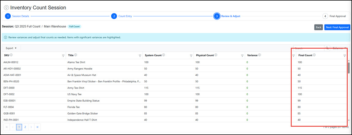 By default, the Final Count matches your physical count, but you can manually adjust it in the field if needed.