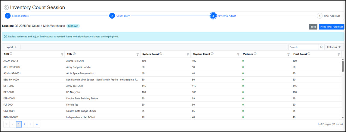 Once the Final Count is set to the desired count for each inventory item, click "Next: Final Approval" to finalize the count session and submit the inventory counts.