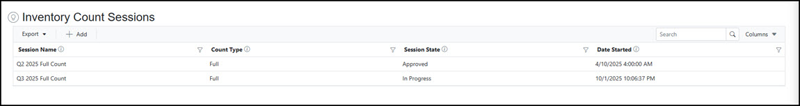 The Inventory Count Sessions grid displays all Inventory Count Sessions that have been initiated. It supports searching, filtering, and sorting, and also allows you to export the data to Excel or PDF formats. Select an Inventory Count Session from the grid to view or manage its details. Click Add to initiate a new Inventory Count Session.
