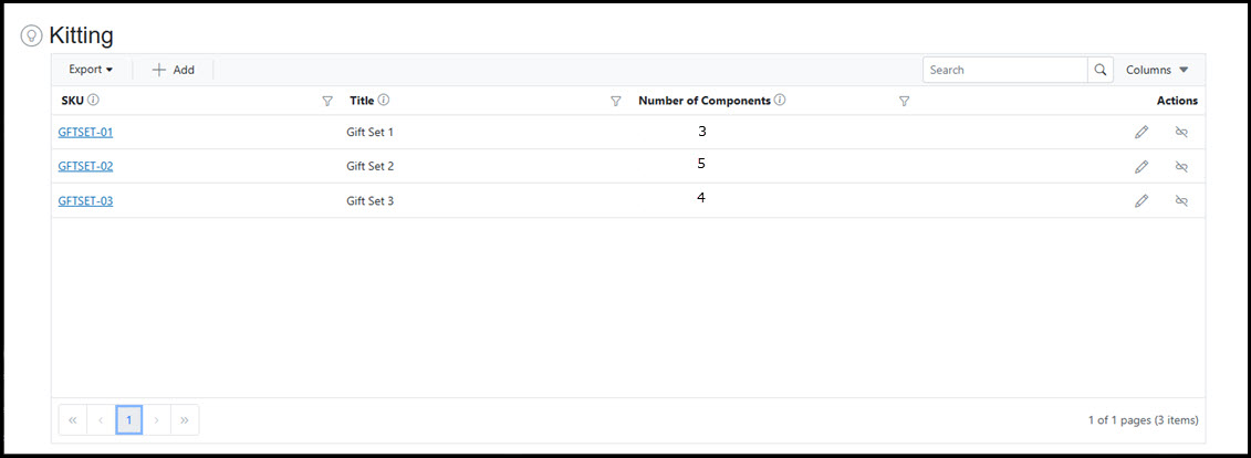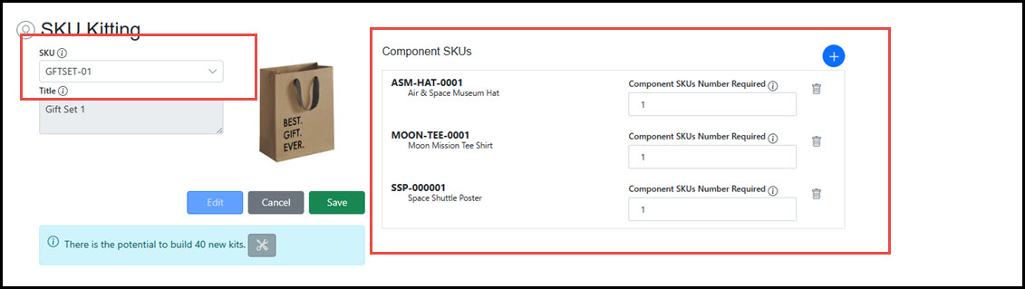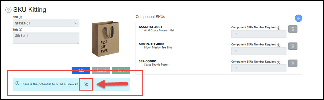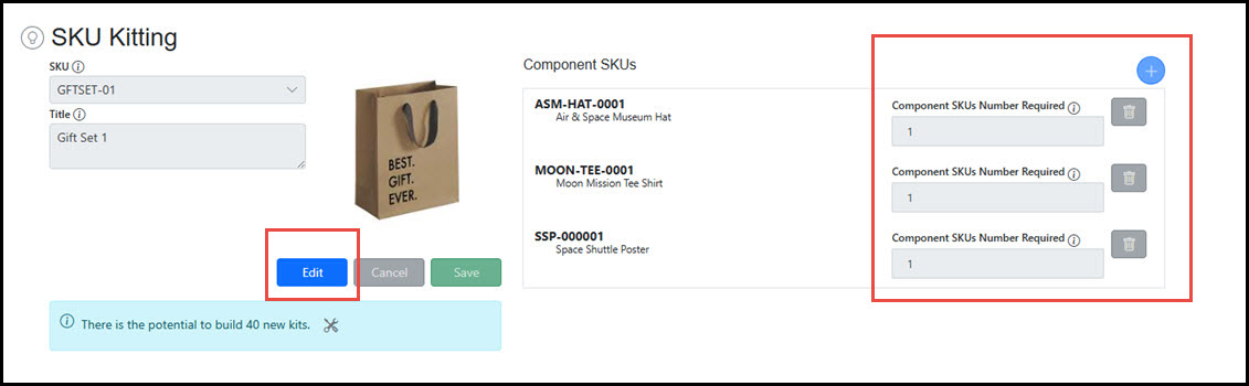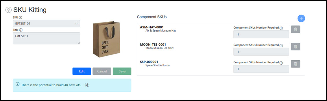 Click the Edit button to modify a kit. Add Component SKUs, deleted existing Component SKUs, or adjust quantities of Component SKUs within the bundle.