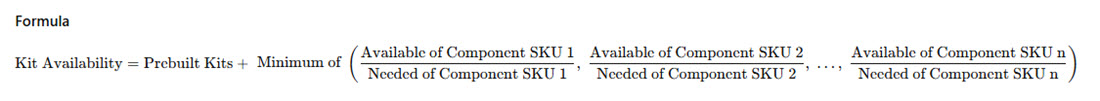| Kit Inventory Calculation Example | ExampleBelow is a simple example of how Skuttlefish uses the Component SKUs and any prebuilt kits to calculate the On Hand inventory of a Kit in the system.Prebuilt Kits = 25 Requirements per Kit: