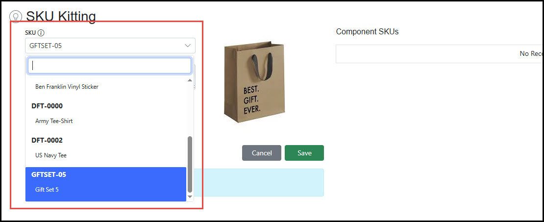 To add a new Kit, click the Add button on the Kitting Grid. Once on the Kitting View, select the SKU that will represent the Kit in the SKU field. Either save the new Kit or add add Component SKUs by clicking the Plus icon in the Component SKUs area. Select the SKUs that will make up the Kit and set the quantity for each. Click Save.