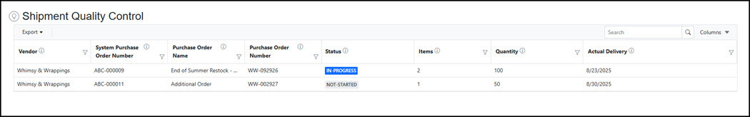 - QC: In-Progress – Once an item is manually entered into the Quality Control process, the status of the shipment moves to "In-Progress". The shipment QC remains in the "In-Progress" status until all items have progressed through the receiving, quality control, and approval process and the shipment is closed.