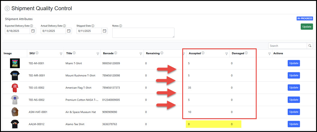 - Item Progress: The progress of the items in the shipment. Tracks the amount awaiting quality control, the accepted amount, and any flagged as damaged.