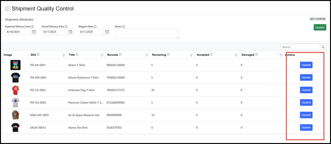 The Shipment Quality Control Manager view consists only of items that have been entered as "Received" in the Shipment Receiving process. Here, the quality control process can move items to an "Accepted" or "Damaged" status based upon physical review or other quality assurance processes.